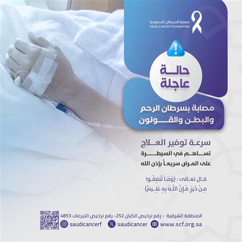 مصابة بسرطان الرحم والبطن والقولون بحاجة لدعمك لتبدأ علاجها ضمن برامج جمعية السرطان السعودية.